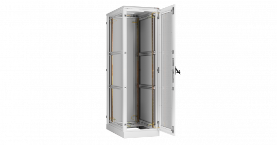 В базовой комплектации шкафа идут 4 монтажных 19” профиля, регулируемых по глубине. Для удобства монтажа и обслуживания установленного в шкафу оборудования конструкцией шкафа предусмотрен доступ с четырех сторон, через переднюю и заднюю дверь, боковые легкосъемные стенки. Боковые стенки шкафа утоплены внутрь каркаса, запираются на защелки и замки с ключами. Передняя и задняя дверь имеет ручку с замком. Передняя/задняя дверь может быть цельнометаллической, перфорированной или со вставкой из ударопрочного, тонированного в массе стекла. Имеется возможность установить левое/правое открытие двери на этапе сборки, либо же перенавесить двери после сборки шкафа. Угол открытия дверей — 180 градусов. Боковые стенки доступны в сплошном или перфорированном исполнении, а также в цельном либо в двухуровневом исполнении. Для обеспечения эффективного теплообмена и поддержания необходимого температурного режима, в крышу и основание шкафа могут быть установлены вентиляторные блоки. Наличие перфорации также повышает эффективность теплообмена. Ввод кабелей осуществляется через крышу или основание шкафа. Все части шкафа соединены в единый контур проводами заземления. Шкафы могут быть состыкованы между собой с помощью комплекта для соединения. Возможна установка шкафа на регулируемые опоры и ролики одновременно.