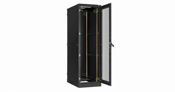 В стандартной комплектации шкафа предусмотрены четыре монтажных профиля 19”, которые регулируются по глубине. Для удобства доступа к оборудованию шкаф открывается с четырех сторон: через передние и задние двери, а также боковые съемные стенки.