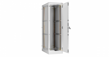 В базовой комплектации шкафа идут 4 монтажных 19” профиля, регулируемых по глубине. Для удобства монтажа и обслуживания установленного в шкафу оборудования конструкцией шкафа предусмотрен доступ с 4 сторон: через переднюю и заднюю двери, а также боковые съемные стенки. Боковые стенки шкафа утоплены внутрь каркаса, запираются на защелки и замки с ключами. Передняя и задняя двери имеют ручку с замком. Дверь можно перевесить, изменив сторону открытия двери. Угол открытия дверей — 180 градусов. Для обеспечения эффективного теплообмена и поддержания необходимого температурного режима, в крышу и основание шкафа могут быть установлены вентиляторные блоки. Наличие перфорации также повышает эффективность теплообмена. Ввод кабелей осуществляется через крышу или основание шкафа. Все части шкафа соединены в единый контур проводами заземления. А между собой шкафы могут быть состыкованы с помощью комплекта для соединения. Кроме того, возможна установка шкафа на регулируемые опоры и ролики одновременно.