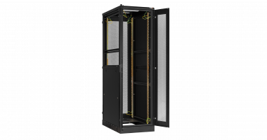 Дверь двухстворчатая перфорированная на раме с замком и петлями для шкафа серии TFA 47U шириной 600мм, черная, пара направляющих.
