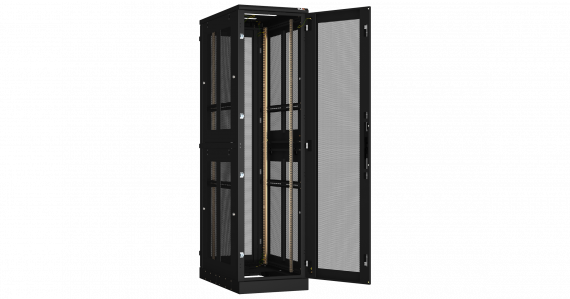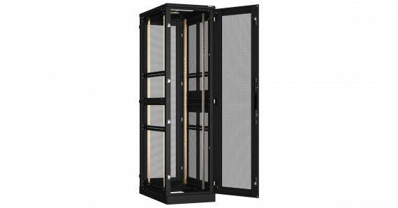 В базовой комплектации шкаф включает 4 регулируемых 19” монтажных профиля. Для удобства доступа предусмотрены двери спереди и сзади, а также боковые съемные стенки. Боковые стенки запираются на защелки и ключи, передние и задние двери имеют замок с возможностью изменения стороны открывания.