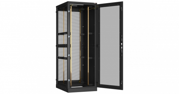 Дверь одностворчатая с оправой под стекло на раме с замком и петлями для шкафа серии TFI 18U шириной 600мм, черный, пара направляющих.