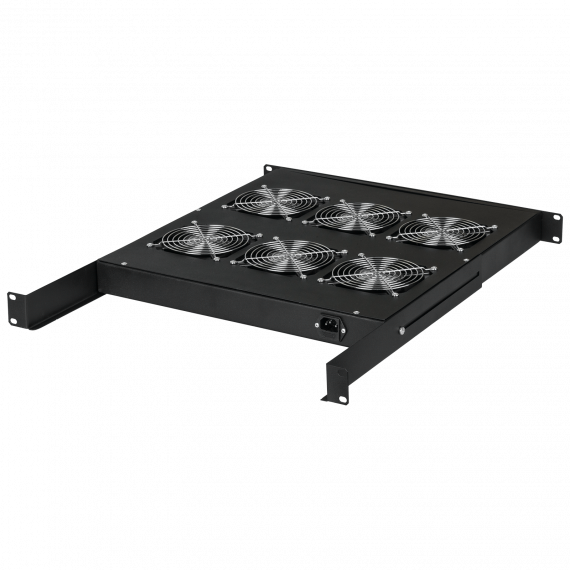 Вентиляторная полка предназначена для создания дополнительного потока воздуха в местах сосредоточения активного оборудования в телекоммуникационном шкафу. Вентиляторные полки можно устанавливать в напольные шкафы и стойки в соответствии с таблицей совместимости аксессуаров. Питание вентиляторной полки осуществляется с помощью подключения шнура питания к сети с напряжением 220 В, 50 Гц. Разъем питания на вентиляторном блоке типа IEC-60320 C14. Вентиляторная полка выполнена в 19” стандарте. Несущая конструкция вентиляторной полки выполнена из 2 мм стали. Вентиляторы закрыты решетками с обеих сторон. Включение/выключение полки осуществляются пользователем. Полка крепятся к направляющим с помощью комплекта крепежа. Крепеж не входит в комплект поставки. Антикоррозионное покрытие выполнено ударопрочной порошковой краской черного цвета. Вентиляторная полка на 6 вентиляторов, глубиной 520 мм, снабжена дополнительными кронштейнами для крепления за заднюю часть. Кронштейны можно регулировать по вылету для подстройки под глубину направляющих шкафа.